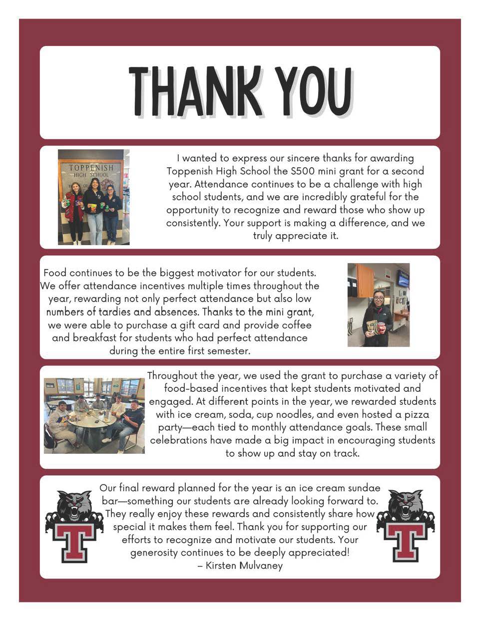 I just wanted to send a heartfelt thank you for awarding Toppenish High School the mini grant again this year. I’ve attached a short PDF to show how your generosity has helped us encourage better attendance and celebrate our students throughout the year. Your support truly makes a difference, and we’re so grateful for the continued opportunity to recognize our students in meaningful ways.