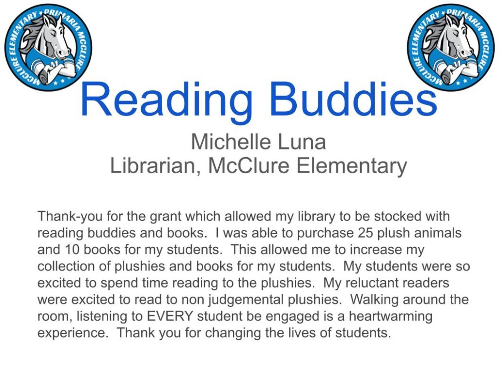 These grants are to be used for books, materials or activities not supplied by the school district. It is our goal to deliver the grants to the recipients before winter break.